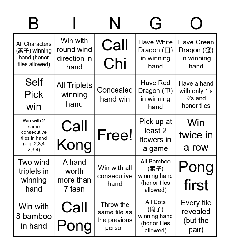 This bingo card has a free space and 24 words: A hand worth more than 7 faan, Call Pong, Concealed hand win, Win with 8 bamboo in hand, Have Green Dragon (發) in winning hand, All Characters (萬子) winning hand (honor tiles allowed), Self Pick win, Win with round wind direction in hand, Pick up at least 2 flowers in a game, Win with all consecutive hand, Have Red Dragon (中) in winning hand, Win with 2 same consecutive tiles in hand (e.g. 2,3,4 2,3,4), All Bamboo (索子) winning hand (honor tiles allowed), Pong first, All Triplets winning hand, All Dots (筒子) winning hand (honor tiles allowed), Win twice in a row, Call Chi, Have a hand with only 1's 9's and honor tiles, Call Kong, Every tile revealed (but the pair), Two wind triplets in winning hand, Have White Dragon (白) in winning hand and Throw the same tile as the previous person.