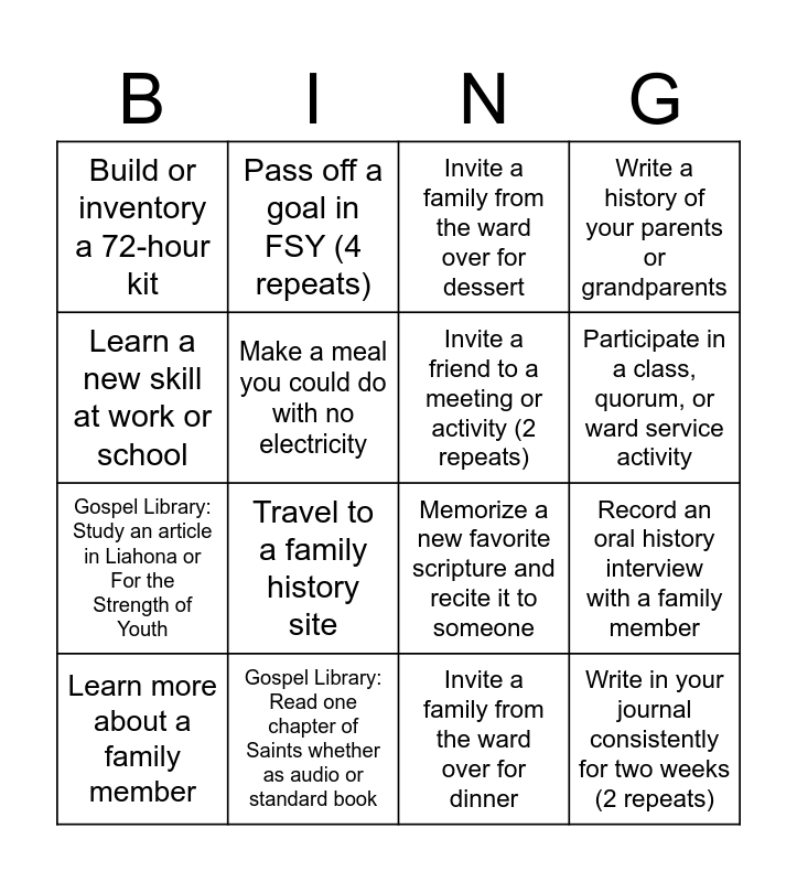 This bingo card has 24 words: Free!, Do a service project found on Just Serve, Participate in a class, quorum, or ward service activity, Do a good deed for a neighbor (2 repeats), Learn a new skill at work or school, Build or inventory a 72-hour kit, Make a meal you could do with no electricity, Pass off a goal in FSY (4 repeats), Gospel Library: Read one chapter of Saints whether as audio or standard book, Gospel Library: Read or listen to the church history chapters from two other countries, Gospel Library: Study an article in Liahona or For the Strength of Youth, Memorize a new favorite scripture and recite it to someone, Watch to a scripture-focused YouTube video, Update your photo in LDS Tools, Invite a friend to a meeting or activity (2 repeats), Participate in a lesson with the missionaries, Invite a family from the ward over for dinner, Invite a family from the ward over for dessert, Travel to a family history site, Record an oral history interview with a family member, Learn more about a family member, Write in your journal consistently for two weeks (2 repeats), Write a history of your parents or grandparents and Do a hike or other outdoor activity as a family.