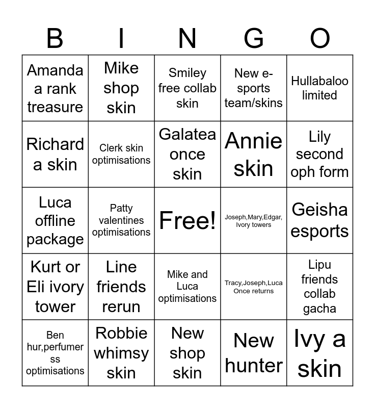 This bingo card has a free space and 24 words: Line friends rerun, Robbie whimsy skin, Galatea once skin, Ben hur,perfumer ss optimisations, Hullabaloo limited, Amanda a rank treasure, Richard a skin, Mike shop skin, Joseph,Mary,Edgar, Ivory towers, Mike and Luca optimisations, Annie skin, Luca offline package, Tracy,Joseph,Luca Once returns, Lipu friends collab gacha, Clerk skin optimisations, New hunter, Geisha esports, Smiley free collab skin, Lily second oph form, Patty valentines optimisations, Ivy a skin, Kurt or Eli ivory tower, New e-sports team/skins and New shop skin.
