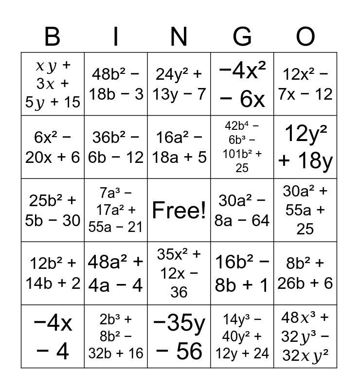 This bingo card has a free space and 25 words: 48a² + 4a − 4, −35y − 56, 16a² − 18a + 5, −4x − 4, 12x² − 7x − 12, 𝑥𝑦 + 3𝑥 + 5𝑦 + 15, 6x² − 20x + 6, 48b² − 18b − 3, 30a² − 8a − 64, 35x² + 12x − 36, 42b⁴ − 6b³ − 101b² + 25, 25b² + 5b − 30, 16b² − 8b + 1, 8b² + 26b + 6, 36b² − 6b − 12, 24a³ + 8a² + 6a + 4, 30a² + 55a + 25, 24y² + 13y − 7, 12y² + 18y, 7a³ − 17a² + 55a − 21, 48𝑥³ + 32𝑦³ − 32𝑥𝑦², 2b³ + 8b² − 32b + 16, 12b² + 14b + 2, −4x² − 6x and 14y³ − 40y² + 12y + 24.