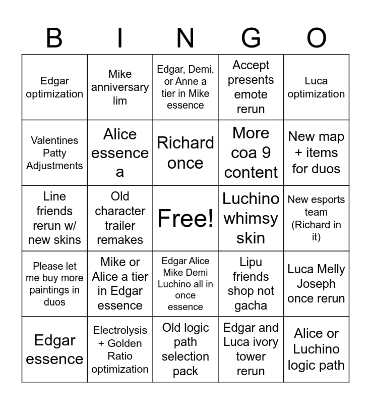 This bingo card has a free space and 24 words: Edgar essence, Mike or Alice a tier in Edgar essence, Richard once, Edgar and Luca ivory tower rerun, Luca optimization, Edgar optimization, Mike anniversary lim, Edgar, Demi, or Anne a tier in Mike essence, Luchino whimsy skin, New esports team (Richard in it), Line friends rerun w/ new skins, Alice essence a, Lipu friends shop not gacha, Luca Melly Joseph once rerun, Valentines Patty Adjustments, Electrolysis + Golden Ratio optimization, Old logic path selection pack, Accept presents emote rerun, New map + items for duos, Please let me buy more paintings in duos, Old character trailer remakes, Edgar Alice Mike Demi Luchino all in once essence, More coa 9 content and Alice or Luchino logic path.