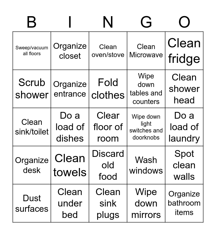 This bingo card has a free space and 24 words: Clean towels, Clean under bed, Fold clothes, Dust surfaces, Clean fridge, Sweep/vacuum all floors, Scrub shower, Organize closet, Wipe down light switches and doorknobs, Discard old food, Wipe down tables and counters, Clean sink/toilet, Wash windows, Spot clean walls, Organize entrance, Wipe down mirrors, Do a load of laundry, Clean oven/stove, Clean shower head, Do a load of dishes, Organize bathroom items, Organize desk, Clean Microwave and Clean sink plugs.