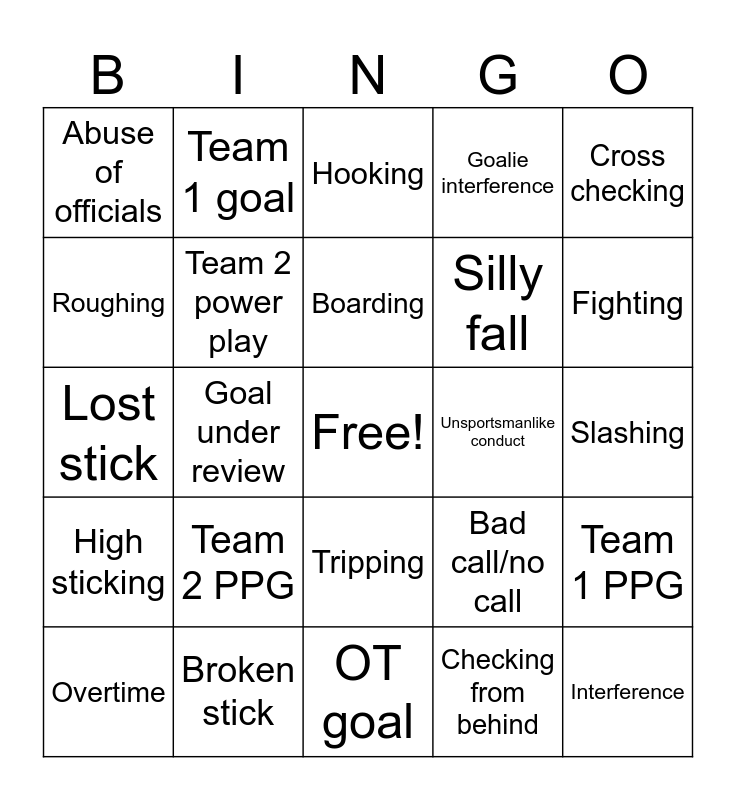 This bingo card has a free space and 37 words: Icing, Offside, Team 1 power play, Team 2 power play, Team 1 PPG, Team 2 PPG, Boarding, Charging, Cross checking, Delay of game, Goal under review, Goalie interference, Interference, Slashing, Roughing, High sticking, Holding, Hooking, Tripping, Unsportsmanlike conduct, Abuse of officials, Fighting, Overtime, OT goal, Shootout, Checking from behind, Team 1 goal, Team 2 goal, Bounces off posts, Too many men on ice, Timeout, Broken stick, Lost stick, Deke, Bad call/no call, Silly fall and Coach argument.