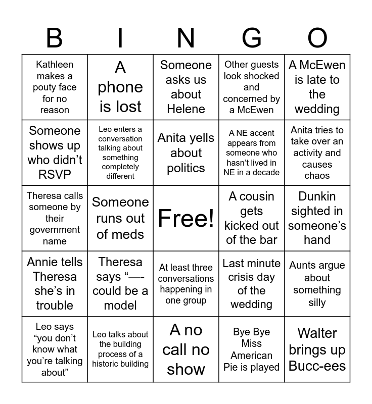This bingo card has a free space and 24 words: Theresa says “—- could be a model, Leo talks about the building process of a historic building, Anita yells about politics, Leo says “you don’t know what you’re talking about”, A McEwen is late to the wedding, Kathleen makes a pouty face for no reason, Someone shows up who didn’t RSVP, A phone is lost, A cousin gets kicked out of the bar, At least three conversations happening in one group, A NE accent appears from someone who hasn’t lived in NE in a decade, Theresa calls someone by their government name, Last minute crisis day of the wedding, Aunts argue about something silly, Leo enters a conversation talking about something completely different, Bye Bye Miss American Pie is played, Dunkin sighted in someone’s hand, Someone asks us about Helene, Anita tries to take over an activity and causes chaos, Someone runs out of meds, Walter brings up Bucc-ees, Annie tells Theresa she’s in trouble, Other guests look shocked and concerned by a McEwen and A no call no show.