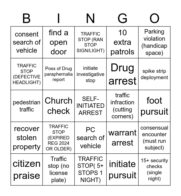 This bingo card has a free space and 24 words: TRAFFIC STOP (EXPIRED REG 2024 OR OLDER), Traffic stop (no license plate), initiate investigative stop, citizen praise, Parking violation (handicap space), consent search of vehicle, TRAFFIC STOP (DEFECTIVE HEADLIGHT), find a open door, traffic infraction (cutting corners), PC search of vehicle, Drug arrest, pedestrian traffic, warrant arrest, consensual encounter (must run subject), Poss of Drug paraphernalia report, initiate pursuit, foot pursuit, TRAFFIC STOP (RAN STOP SIGN/LIGHT), spike strip deployment, Church check, 15+ security checks (single night), recover stolen property, 10 extra patrols and TRAFFIC STOP( 5+ STOPS 1 NIGHT).