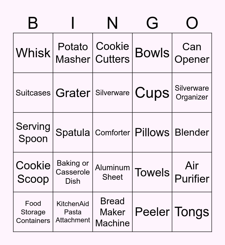 This bingo card has 49 words: Free!, Comforter, Quilt, Bread Maker Machine, Baking or Casserole Dish, Towel Warmer, Potato Masher, Steamer, Suitcases, Pot Holders, Grater, Bowls, Air Purifier, Towels, Measuring Cups, Panini Press, Silverware, Pillows, Plates, Can Opener, Spatula, Peeler, Whisk, Cups, Strainer, Silverware Organizer, Food Storage Containers, Sheets, Aluminum Sheet, Cookie Scoop, Salad Spinner, Label Maker, Cookbook Stand, Coolers, KitchenAid Pasta Attachment, Zester, Griddle, Cutting Boards, Blender, Cooling Rack, Hand Mixer, Cookbook, Tongs, Pitcher, Serving Spoon, Cookie Cutters, Serving Plate, Kitchen Canister and Crockpot.