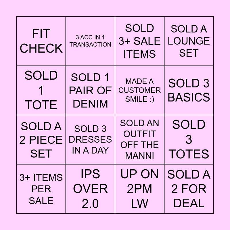 This bingo card has 16 words: IPS OVER 2.0, SOLD 3 TOTES, SOLD 3+ SALE ITEMS, FIT CHECK, SOLD A 2 PIECE SET, 3 ACC IN 1 TRANSACTION, SOLD AN OUTFIT OFF THE MANNI, UP ON 2PM LW, SOLD 1 TOTE, SOLD 1 PAIR OF DENIM, 3+ ITEMS PER SALE, SOLD A LOUNGE SET, SOLD 3 DRESSES IN A DAY, SOLD 3 BASICS, MADE A CUSTOMER SMILE :) and SOLD A 2 FOR DEAL.
