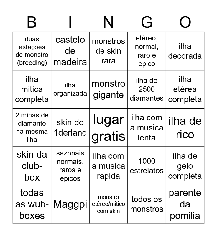 This bingo card has a free space and 24 words: sazonais normais, raros e epicos, Maggpi, monstro gigante, todas as wub-boxes, ilha decorada, duas estações de monstro (breeding), ilha mitica completa, castelo de madeira, ilha com a musica lenta, ilha com a musica rapida, ilha de 2500 diamantes, 2 minas de diamante na mesma ilha, 1000 estrelatos, ilha de gelo completa, ilha organizada, todos os monstros, ilha de rico, monstros de skin rara, ilha etérea completa, skin do 1derland, parente da pomilia, skin da club-box, etéreo, normal, raro e epico and monstro etéreo/mitico com skin.