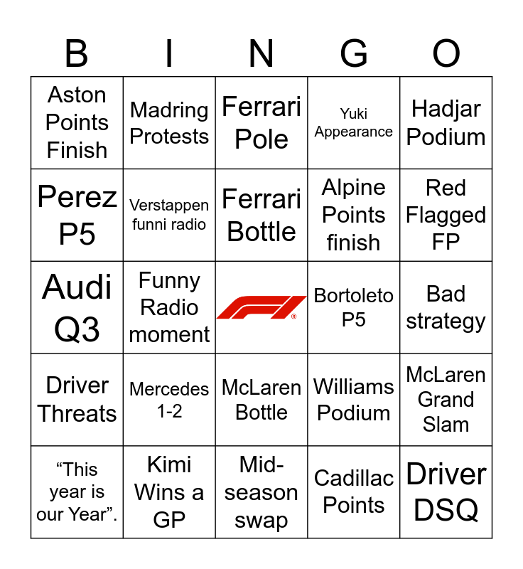 This bingo card has a free space and 24 words: Mercedes 1-2, Kimi Wins a GP, Ferrari Bottle, “This year is our Year”., Hadjar Podium, Aston Points Finish, Perez P5, Madring Protests, Bortoleto P5, McLaren Bottle, Alpine Points finish, Audi Q3, Williams Podium, McLaren Grand Slam, Verstappen funni radio, Cadillac Points, Bad strategy, Ferrari Pole, Red Flagged FP, Funny Radio moment, Driver DSQ, Driver Threats, Yuki Appearance and Mid-season swap.
