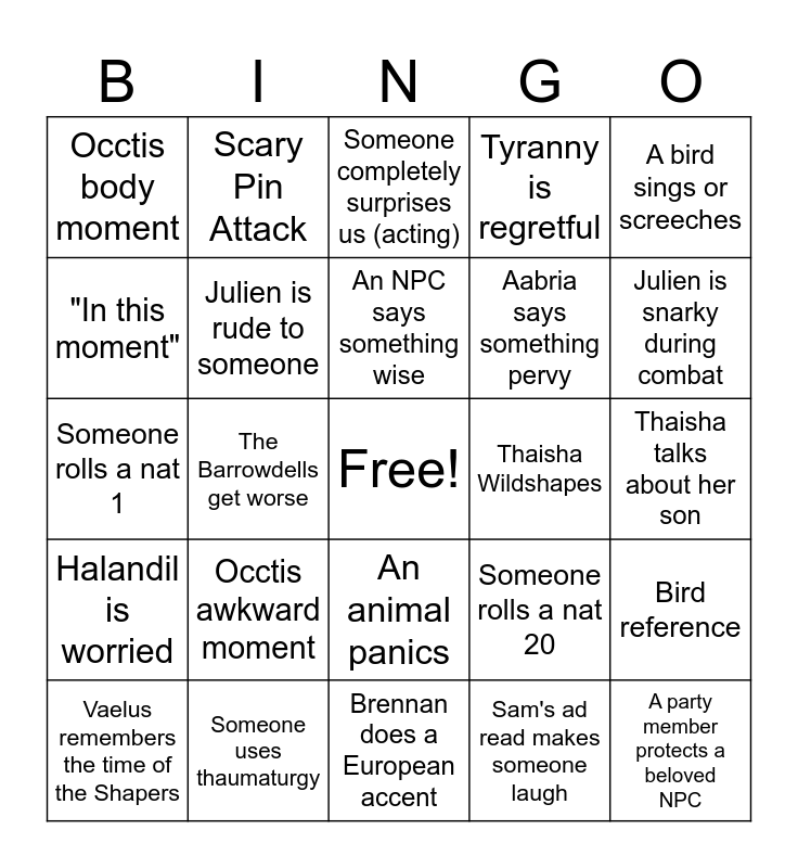 This bingo card has a free space and 25 words: Occtis awkward moment, Brennan does a European accent, An NPC says something wise, Vaelus remembers the time of the Shapers, A bird sings or screeches, Occtis body moment, "In this moment", Scary Pin Attack, Thaisha Wildshapes, An animal panics, Aabria says something pervy, Someone rolls a nat 1, Someone rolls a nat 20, Bird reference, Julien is rude to someone, Brennans says "In...credible", Thaisha talks about her son, Someone completely surprises us (acting), Julien is snarky during combat, The Barrowdells get worse, A party member protects a beloved NPC, Someone uses thaumaturgy, Halandil is worried, Tyranny is regretful and Sam's ad read makes someone laugh.