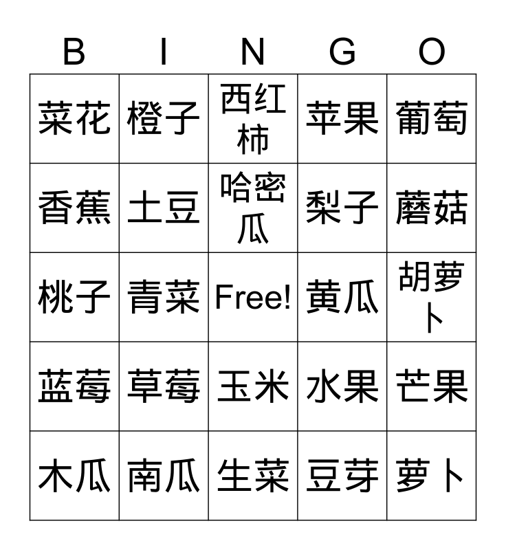 水果和蔬菜 | 蔬菜和水果 | 蔬菜和水果 | Chinese Words Bingo | C7 - Fruits and Vegetables (Chinese)