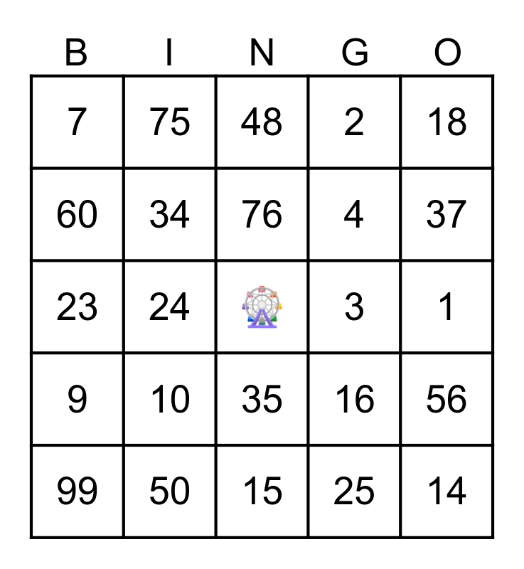This bingo card has a free space and 24 words: 10, 50, 76, 99, 18, 7, 60, 75, 3, 35, 4, 23, 16, 56, 34, 25, 1, 48, 37, 24, 14, 9, 2 and 15.