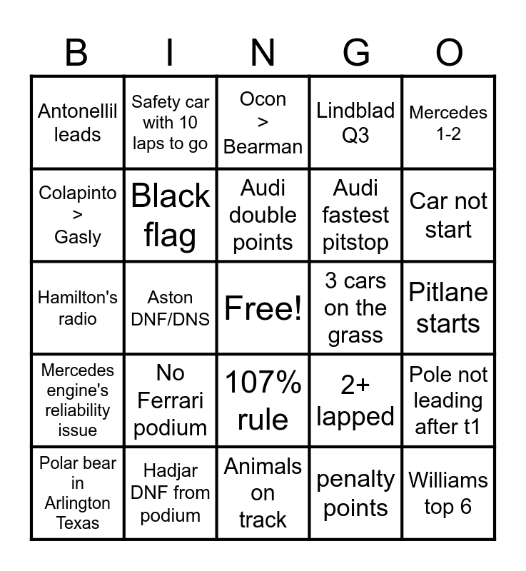 This bingo card has a free space and 24 words: No Ferrari podium, Hadjar DNF from podium, Audi double points, Polar bear in Arlington Texas, Mercedes 1-2, Antonellil leads, Colapinto > Gasly, Safety car with 10 laps to go, 3 cars on the grass, 107% rule, Audi fastest pitstop, Hamilton's radio, 2+ lapped, Pole not leading after t1, Black flag, penalty points, Pitlane starts, Ocon > Bearman, Car not start, Aston DNF/DNS, Williams top 6, Mercedes engine's reliability issue, Lindblad Q3 and Animals on track.