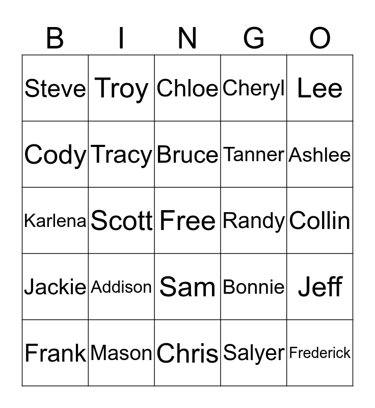 This bingo card has a free space and 24 words: Addison, Mason, Bruce, Frank, Lee, Steve, Cody, Troy, Randy, Sam, Tanner, Karlena, Bonnie, Jeff, Tracy, Salyer, Collin, Chloe, Ashlee, Scott, Frederick, Jackie, Cheryl and Chris.