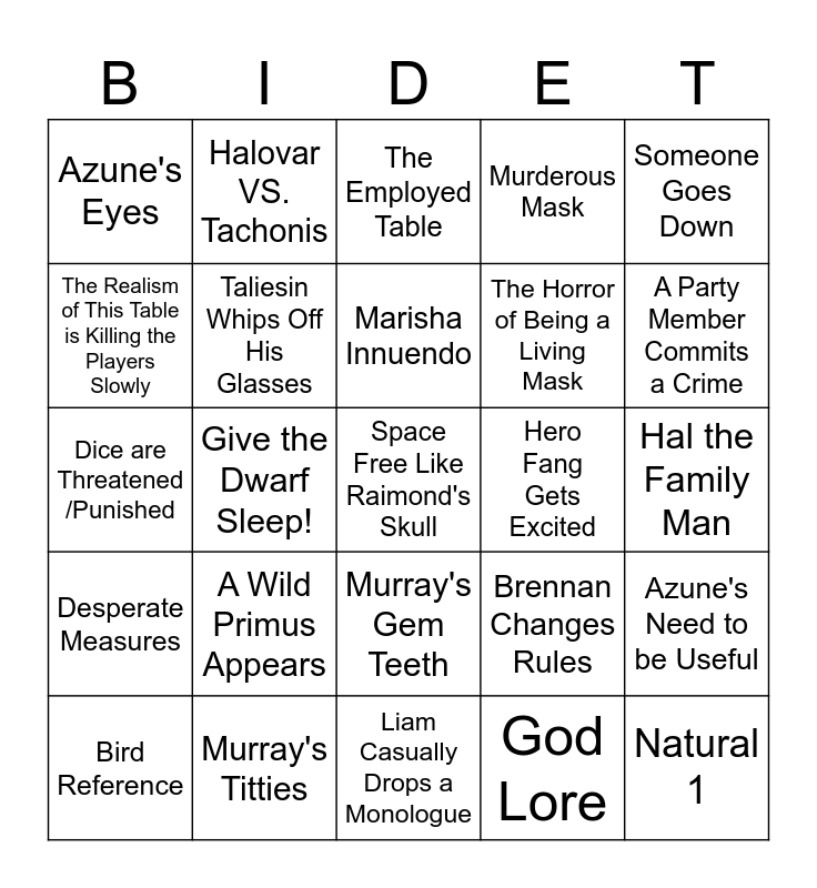 This bingo card has a free space and 44 words: Natural 20, Natural 1, Makin' Ma Wayyy, Bird Reference, Unhinged Sam Ad, God Lore, The Employed Table, Attacking the Theatre Kids, Someone Goes Down, Murray's Titties, Murderous Mask, Hero Fang Gets Excited, Murray's Gem Teeth, A Wild Primus Appears, Tachonis are the WORST, Liam Casually Drops a Monologue, Murray's Quill Nail, Dice are Threatened /Punished, Political Puzzles, A Party Member Commits a Crime, Halovar VS. Tachonis, Brennan is Shocked by an Outcome, Anti-Capitalist Message, Azune's Eyes, In...Credible, Hal the Family Man, Brennan's Handmade Map, Rules-Lawyering, Brennan Changes Rules, Desperate Measures, Inter-Party Conflict, Azune's Need to be Useful, Message, Portent Rolls!, Give the Dwarf Sleep!, Young Azune, Insight Check!, Bolaire and Murray Plan Schenanigans in Advance, Marisha Innuendo, The Realism of This Table is Killing the Players Slowly, The Horror of Being a Living Mask, Taliesin Does The Face, Taliesin Whips Off His Glasses and Liam and Luis Have an Actors' Spar.