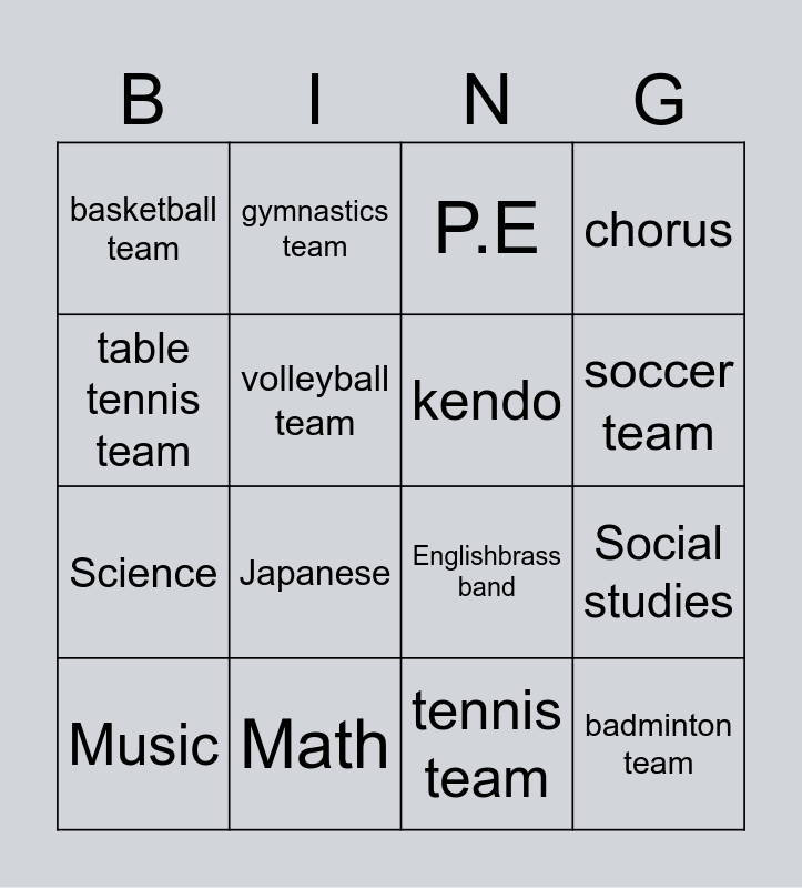 This bingo card has 18 words: Japanese, badminton team, P.E, basketball team, Englishbrass band, chorus, Music, gymnastics team, soccer team, Science, tennis team, table tennis team, Social studies, volleyball team, kendo, swimming club, Math and Arts and craft.