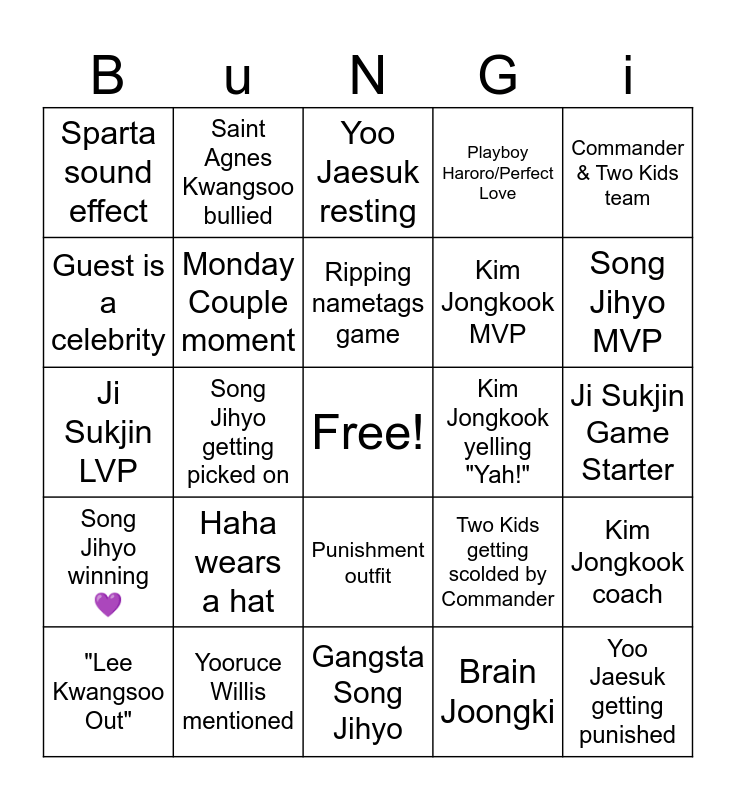 This bingo card has a free space and 24 words: Haha wears a hat, Yooruce Willis mentioned, Ripping nametags game, "Lee Kwangsoo Out", Commander & Two Kids team, Sparta sound effect, Guest is a celebrity, Saint Agnes Kwangsoo bullied, Kim Jongkook yelling "Yah!", Punishment outfit, Kim Jongkook MVP, Ji Sukjin LVP, Two Kids getting scolded by Commander, Kim Jongkook coach, Monday Couple moment, Brain Joongki, Ji Sukjin Game Starter, Yoo Jaesuk resting, Song Jihyo MVP, Song Jihyo getting picked on, Yoo Jaesuk getting punished, Song Jihyo winning 💜, Playboy Haroro/Perfect Love and Gangsta Song Jihyo.