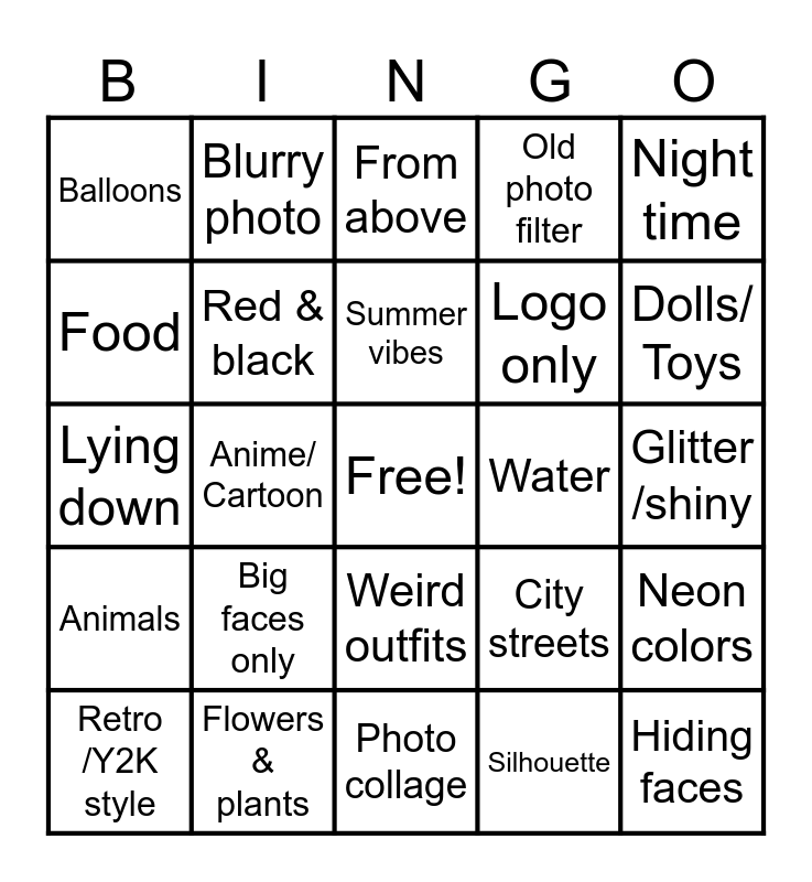 This bingo card has a free space and 24 words: Big faces only, Flowers & plants, Summer vibes, Retro /Y2K style, Night time, Balloons, Food, Blurry photo, Water, Weird outfits, Logo only, Lying down, City streets, Neon colors, Red & black, Silhouette, Glitter /shiny, From above, Dolls/ Toys, Anime/ Cartoon, Hiding faces, Animals, Old photo filter and Photo collage.