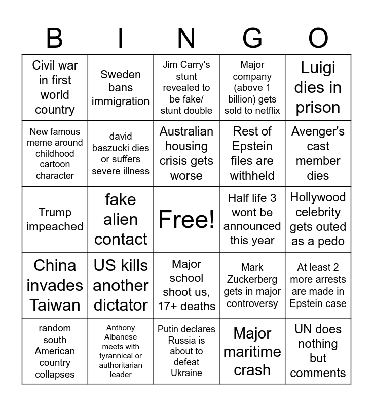 This bingo card has a free space and 24 words: US kills another dictator, Anthony Albanese meets with tyrannical or authoritarian leader, Australian housing crisis gets worse, random south American country collapses, Luigi dies in prison, Civil war in first world country, New famous meme around childhood cartoon character, Sweden bans immigration, Half life 3 wont be announced this year, Major school shoot us, 17+ deaths, Rest of Epstein files are withheld, Trump impeached, Mark Zuckerberg gets in major controversy, At least 2 more arrests are made in Epstein case, david baszucki dies or suffers severe illness, Major maritime crash, Hollywood celebrity gets outed as a pedo, Jim Carry's stunt revealed to be fake/ stunt double, Avenger's cast member dies, fake alien contact, UN does nothing but comments, China invades Taiwan, Major company (above 1 billion) gets sold to netflix and Putin declares Russia is about to defeat Ukraine.