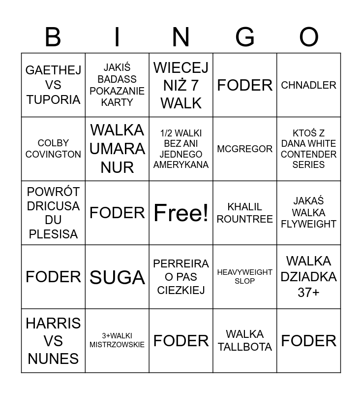 This bingo card has a free space and 24 words: SUGA, 3+WALKI MISTRZOWSKIE, 1/2 WALKI BEZ ANI JEDNEGO AMERYKANA, HARRIS VS NUNES, CHNADLER, GAETHEJ VS TUPORIA, COLBY COVINGTON, JAKIŚ BADASS POKAZANIE KARTY, KHALIL ROUNTREE, PERREIRA O PAS CIEZKIEJ, MCGREGOR, POWRÓT DRICUSA DU PLESISA, HEAVYWEIGHT SLOP, WALKA DZIADKA 37+, WALKA UMARA NUR, WALKA TALLBOTA, JAKAŚ WALKA FLYWEIGHT, WIECEJ NIŻ 7 WALK, KTOŚ Z DANA WHITE CONTENDER SERIES, FODER, FODER, FODER, FODER and FODER.