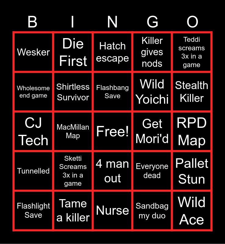 This bingo card has a free space and 24 words: Sketti Screams 3x in a game, Tame a killer, Flashbang Save, Flashlight Save, Teddi screams 3x in a game, Wesker, Wholesome end game, Die First, Get Mori'd, 4 man out, Wild Yoichi, CJ Tech, Everyone dead, Pallet Stun, Shirtless Survivor, Sandbag my duo, RPD Map, Hatch escape, Stealth Killer, MacMillan Map, Wild Ace, Tunnelled, Killer gives nods and Nurse.