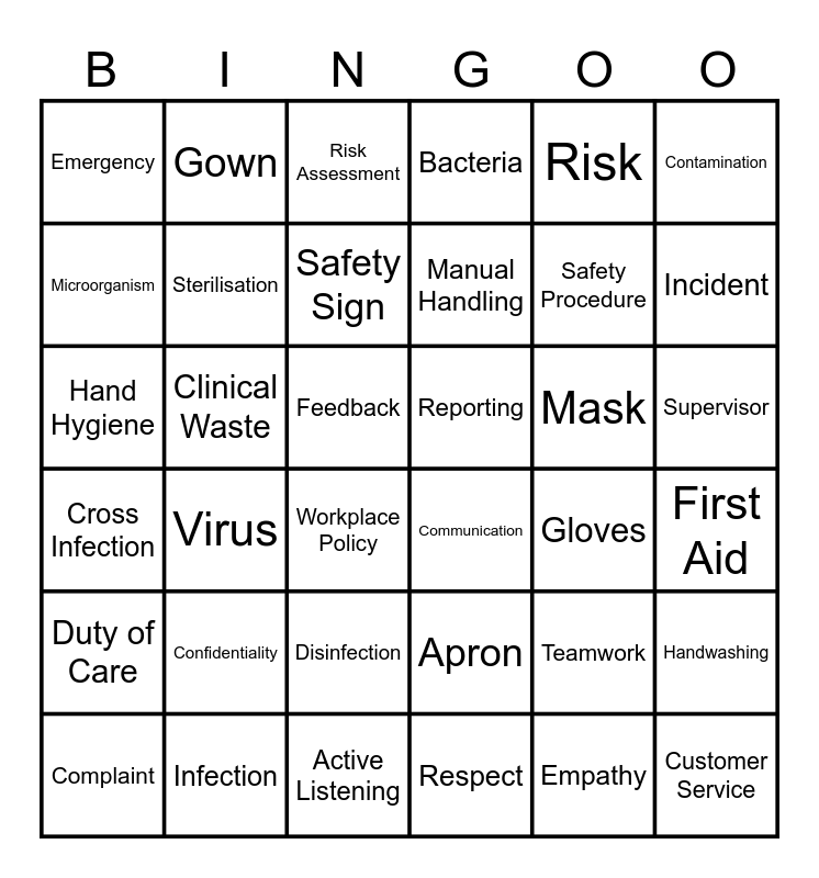 This bingo card has 49 words: Free!, Hand Hygiene, PPE, Gloves, Mask, Apron, Gown, Sharps, Contamination, Infection, Microorganism, Bacteria, Virus, Cross Infection, Cleaning, Disinfection, Sterilisation, Clinical Waste, Hazard, Risk, Incident, First Aid, Emergency, Safety Sign, Evacuation, Manual Handling, Workplace Policy, Procedure, Supervisor, Reporting, Documentation, Confidentiality, Customer Service, Professionalism, Communication, Active Listening, Respect, Empathy, Feedback, Complaint, Service Standard, Teamwork, Duty of Care, Infection Control, Safety Procedure, Risk Assessment, Safety Equipment, Handwashing and Spill Kit.