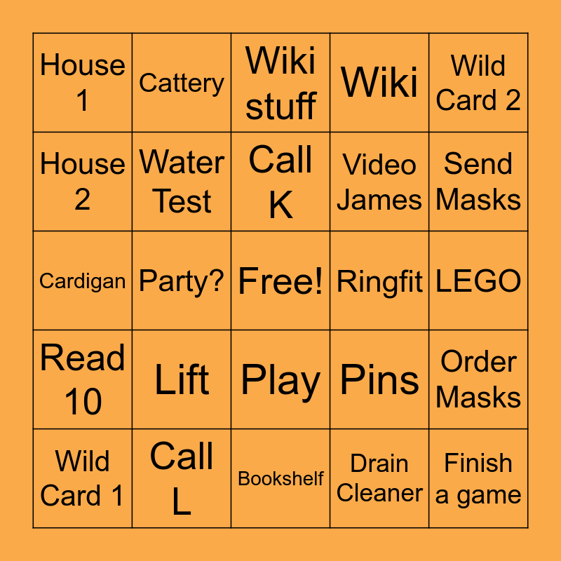 This bingo card has a free space and 24 words: Lift, Call L, Call K, Wild Card 1, Wild Card 2, House 1, House 2, Cattery, Ringfit, Play, Video James, Cardigan, Pins, Order Masks, Water Test, Drain Cleaner, LEGO, Wiki stuff, Send Masks, Party?, Finish a game, Read 10, Wiki and Bookshelf.