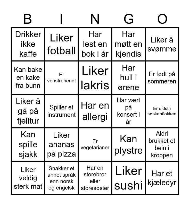This bingo card has 25 words: Liker ananas på pizza, Har en storebror eller storesøster, Liker lakris, Liker veldig sterk mat, Liker å svømme, Drikker ikke kaffe, Kan bake en kake fra bunn, Liker fotball, Har vært på konsert i år, Er vegetarianer, Har hull i ørene, Liker å gå på fjelltur, Kan plystre, Aldri brukket et bein i kroppen, Er venstrehendt, Har et kjæledyr, Er eldst i søskenflokken, Har lest en bok i år, Er født på sommeren, Spiller et instrument, Har en allergi, Snakker et annet språk enn norsk og engelsk, Kan spille sjakk, Har møtt en kjendis and Liker sushi.