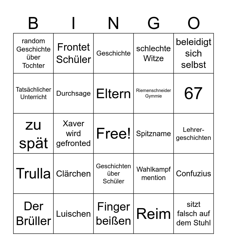 This bingo card has a free space and 29 words: Der Brüller, Excessives Fluchen, Xaver wird gefronted, kommt nicht mit Technik klar, random Geschichte über Tochter, Geschichte, Durchsage, Clärchen, Spitzname, Luischen, Lehrer-geschichten, sitzt falsch auf dem Stuhl, Finger beißen, Reim, 67, saufen, Geschichten über Schüler, Trulla, beleidigt sich selbst, zu spät, Wahlkampf mention, Gymmie hoodie, Riemenschneider Gymmie, Tatsächlicher Unterricht, schlechte Witze, Frontet Schüler, Confuzius, Eltern and Motorrad.