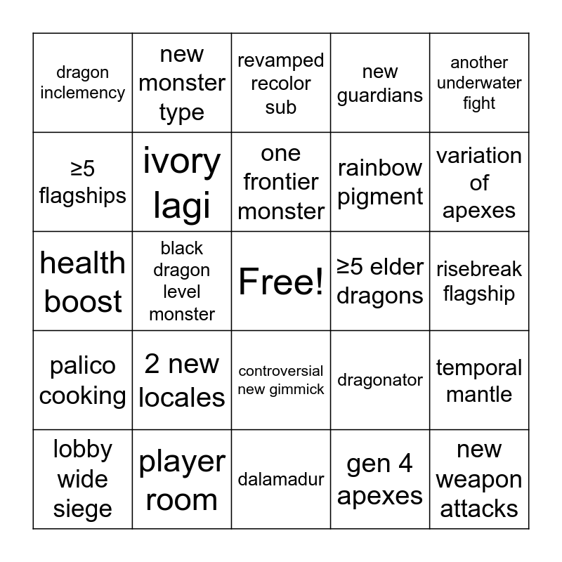 This bingo card has a free space and 24 words: 2 new locales, player room, one frontier monster, lobby wide siege, another underwater fight, dragon inclemency, ≥5 flagships, new monster type, ≥5 elder dragons, controversial new gimmick, rainbow pigment, health boost, dragonator, temporal mantle, ivory lagi, gen 4 apexes, risebreak flagship, revamped recolor sub, variation of apexes, black dragon level monster, new weapon attacks, palico cooking, new guardians and dalamadur.