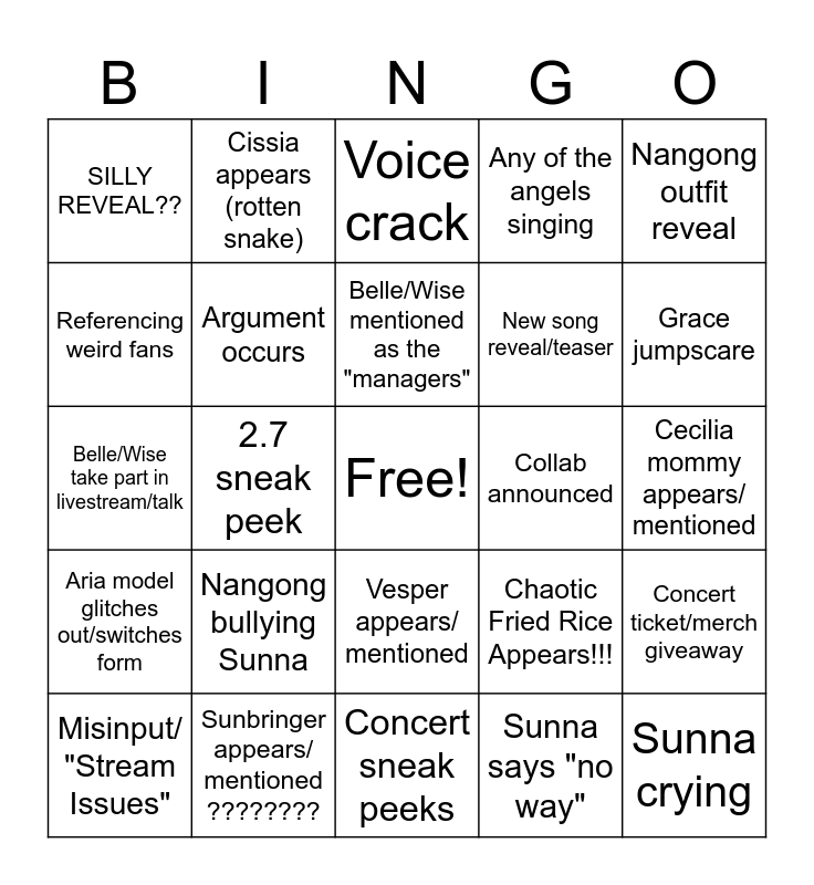 This bingo card has a free space and 24 words: Misinput/ "Stream Issues", Nangong bullying Sunna, Belle/Wise mentioned as the "managers", Sunna says "no way", Nangong outfit reveal, SILLY REVEAL??, Cissia appears (rotten snake), Voice crack, Collab announced, Cecilia mommy appears/ mentioned, Belle/Wise take part in livestream/talk, Argument occurs, Chaotic Fried Rice Appears!!!, Concert ticket/merch giveaway, Referencing weird fans, Sunbringer appears/ mentioned ????????, Concert sneak peeks, Any of the angels singing, Grace jumpscare, Aria model glitches out/switches form, 2.7 sneak peek, Vesper appears/ mentioned, New song reveal/teaser and Sunna crying.