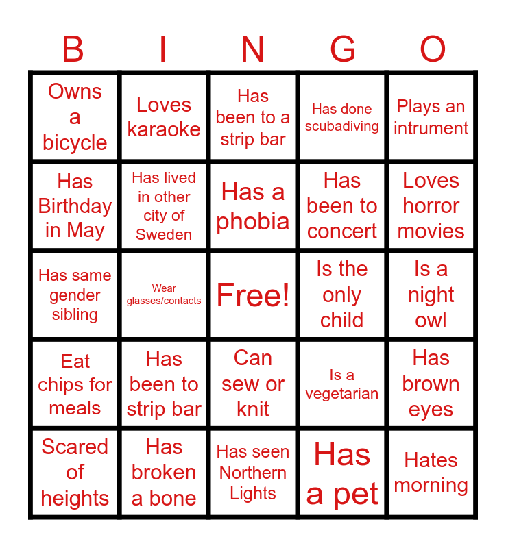 This bingo card has a free space and 24 words: Has been to strip bar, Has broken a bone, Has a phobia, Scared of heights, Plays an intrument, Owns a bicycle, Has Birthday in May, Loves karaoke, Is the only child, Can sew or knit, Has been to concert, Has same gender sibling, Is a vegetarian, Has brown eyes, Has lived in other city of Sweden, Has a pet, Is a night owl, Has been to a strip bar, Loves horror movies, Wear glasses/contacts, Hates morning, Eat chips for meals, Has done scubadiving and Has seen Northern Lights.