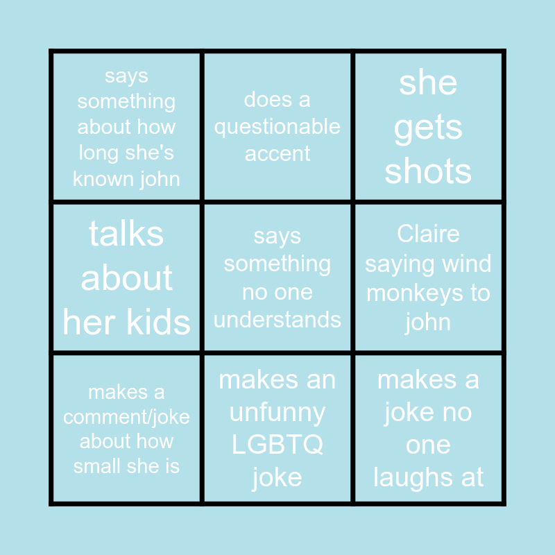 This bingo card has a free space and 8 words: Claire saying wind monkeys to john, she gets shots, does a questionable accent, makes a comment/joke about how small she is, says something about how long she's known john, makes a joke no one laughs at, talks about her kids and makes an unfunny LGBTQ joke.
