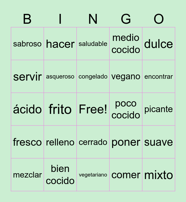 This bingo card has a free space and 41 words: abierto, ácido, asado a la parrilla, asqueroso, bien cocido, cerrado, congelado, crudo, dulce, fresco, frito, medio cocido, mixto, picante, poco cocido, relleno, rico, sabroso, salado, saludable, suave, típico, vegetariano, vegano, beber, cocinar, comer, disfrutar, encontrar, preparar, freír, hacer, mezclar, pedir, poner, servir, probar, sacar, sazonar, tomar and usar.