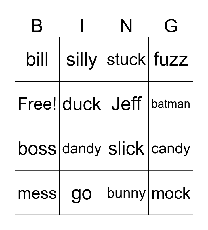 This bingo card has 16 words: go, candy, stuck, bill, boss, silly, slick, bunny, Free!, duck, mess, fuzz, dandy, batman, Jeff and mock.