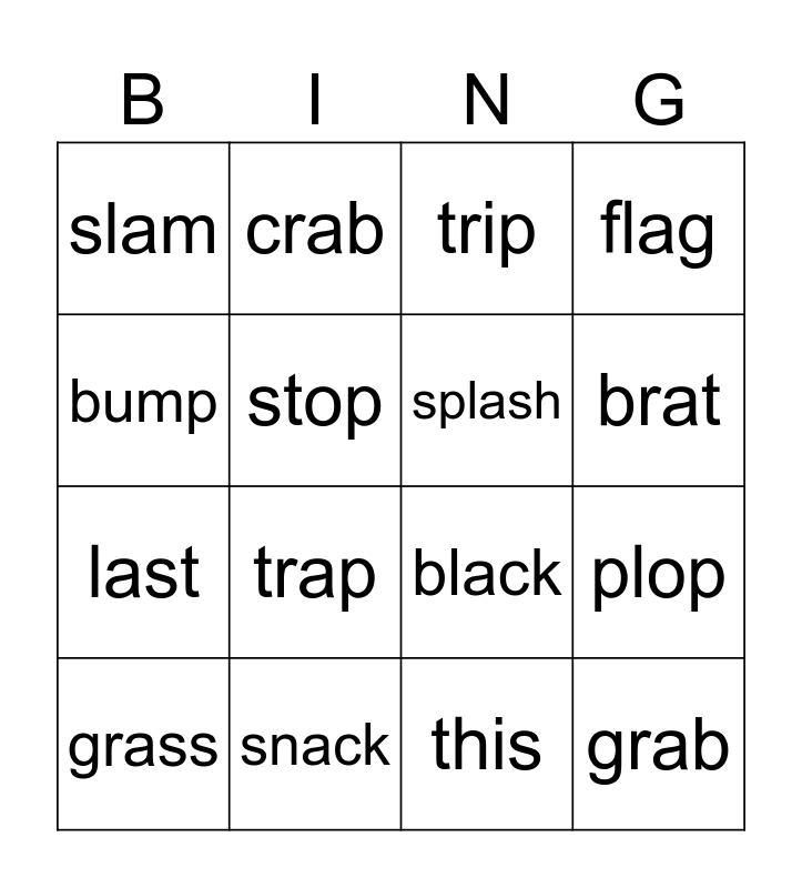 This bingo card has 16 words: snack, plop, trip, slam, last, crab, black, this, bump, stop, grass, flag, trap, brat, splash and grab.