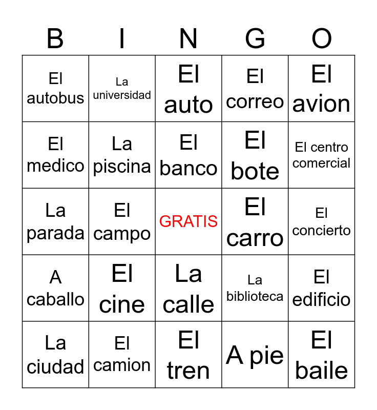 This bingo card has a free space and 29 words: La ciudad, El pueblo, El campo, La playa, El autobus, El auto, La piscina, El cine, El carro, El camion, El concierto, El baile, El tren, A pie, El centro comercial, El estadio, La calle, A caballo, El avion, La parada, La biblioteca, El barco, El bote, El medico, El correo, La universidad, El edificio, El banco and El aeropuerto.