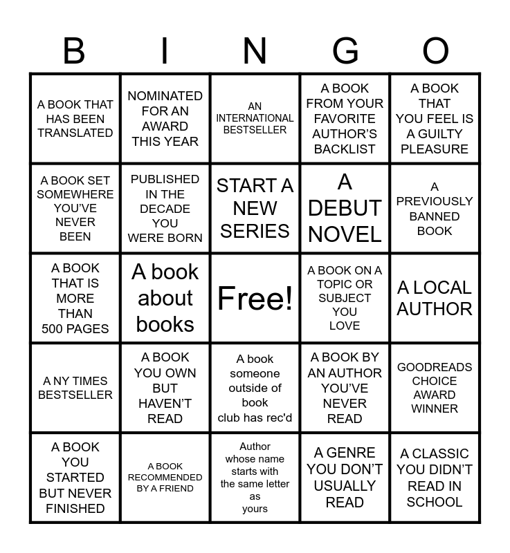 This bingo card has a free space and 24 words: A BOOK YOU OWN BUT HAVEN’T READ, A BOOK RECOMMENDED BY A FRIEND, START A NEW SERIES, A BOOK YOU STARTED BUT NEVER FINISHED, A BOOK THAT YOU FEEL IS A GUILTY PLEASURE, A BOOK THAT HAS BEEN TRANSLATED, A BOOK SET SOMEWHERE YOU’VE NEVER BEEN, NOMINATED FOR AN AWARD THIS YEAR, A BOOK ON A TOPIC OR SUBJECT YOU LOVE, A book someone outside of book club has rec'd, A DEBUT NOVEL, A BOOK THAT IS MORE THAN 500 PAGES, A BOOK BY AN AUTHOR YOU’VE NEVER READ, GOODREADS CHOICE AWARD WINNER, PUBLISHED IN THE DECADE YOU WERE BORN, A GENRE YOU DON’T USUALLY READ, A LOCAL AUTHOR, AN INTERNATIONAL BESTSELLER, A PREVIOUSLY BANNED BOOK, A book about books, A CLASSIC YOU DIDN’T READ IN SCHOOL, A NY TIMES BESTSELLER, A BOOK FROM YOUR FAVORITE AUTHOR’S BACKLIST and Author whose name starts with the same letter as yours.