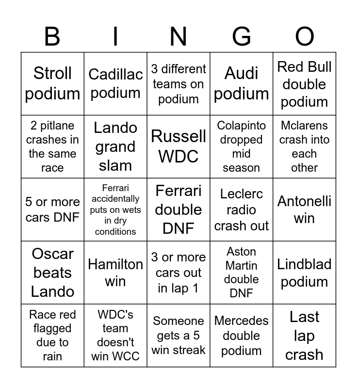 This bingo card has 25 words: Hamilton win, Someone gets a 5 win streak, Russell WDC, Race red flagged due to rain, Red Bull double podium, Stroll podium, 2 pitlane crashes in the same race, Cadillac podium, Leclerc radio crash out, 3 or more cars out in lap 1, Colapinto dropped mid season, 5 or more cars DNF, Aston Martin double DNF, Lindblad podium, Lando grand slam, Last lap crash, Antonelli win, 3 different teams on podium, Mclarens crash into each other, Ferrari accidentally puts on wets in dry conditions, Ferrari double DNF, WDC's team doesn't win WCC, Oscar beats Lando, Audi podium and Mercedes double podium.