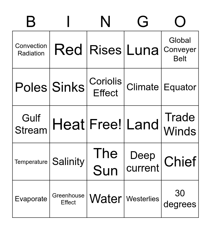 This bingo card has a free space and 30 words: Greenhouse Effect, Carbon Dioxide, Heat, Conduction, Convection Radiation, Rises, Sinks, The Sun, Land, Water, Trade Winds, 30 degrees, Westerlies, Polar easterlies, Equator, Surface current, Deep current, Temperature, Salinity, Global Conveyer Belt, Gulf Stream, Blue, Red, Climate, Poles, Luna, Chief, Evaporate, Coriolis Effect and Earth’s Tilted Axis.