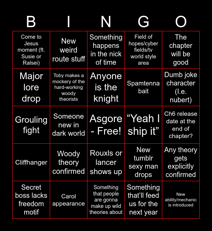 This bingo card has a free space and 24 words: Woody theory confirmed, Carol appearance, Anyone is the knight, Secret boss lacks freedom motif, The chapter will be good, Come to Jesus moment (ft. Susie or Ralsei), Major lore drop, New weird route stuff, “Yeah I ship it”, Rouxls or lancer shows up, Spamtenna bait, Grouling fight, New tumblr sexy man drops, Any theory gets explicitly confirmed, Toby makes a mockery of the hard-working woody theorists, Something that’ll feed us for the next year, Ch6 release date at the end of chapter?, Something happens in the nick of time, Dumb joke character (I.e. nubert), Someone new in dark world, New ability/mechanic is introduced, Cliffhanger, Field of hopes/cyber fields/tv world style area and Something that people are gonna make up wild theories about.