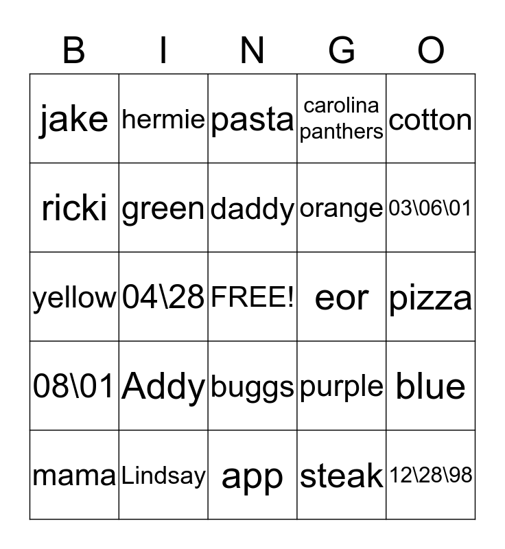 This bingo card has a free space and 24 words: Addy, Lindsay, daddy, mama, cotton, jake, ricki, hermie, eor, buggs, orange, yellow, purple, blue, green, steak, pizza, pasta, 03\06\01, 04\28, 12\28\98, 08\01, carolina panthers and app.