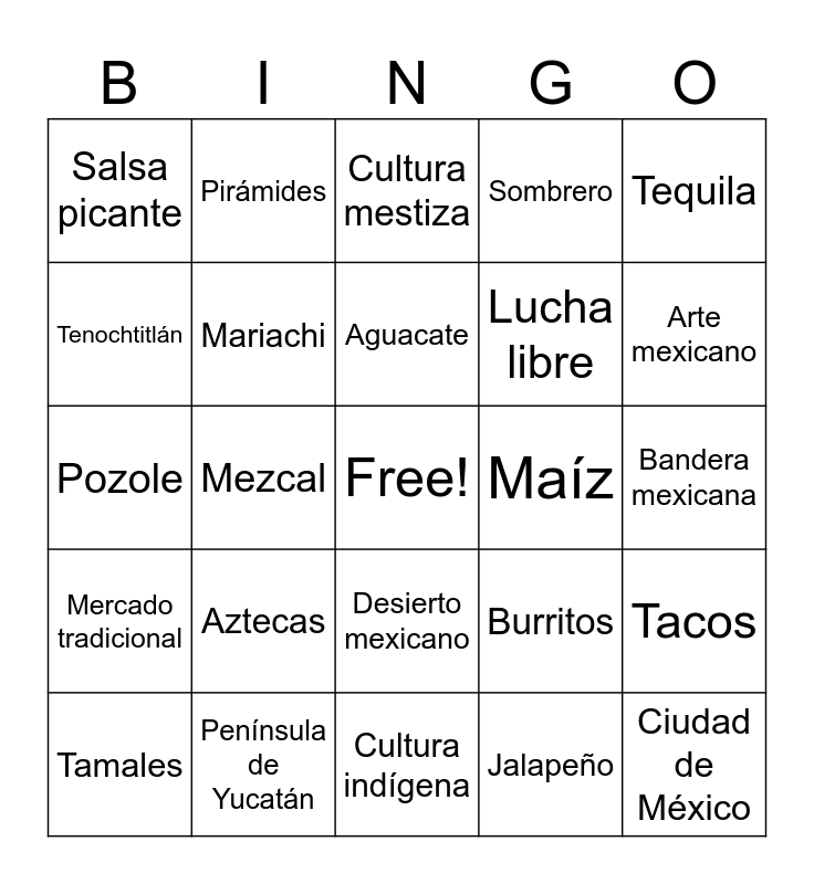 This bingo card has a free space and 50 words: México, Ciudad de México, Español, Cultura indígena, Aztecas, Mayas, Pirámides, Chichén Itzá, Tenochtitlán, Día de los Muertos, Mariachi, Sombrero, Tacos, Burritos, Enchiladas, Guacamole, Aguacate, Maíz, Chocolate (origen mesoamericano), Tequila, Mezcal, Jalapeño, Salsa picante, Lucha libre, Frida Kahlo, Diego Rivera, Arte mexicano, Murales, Cultura mestiza, Desierto mexicano, Selvas del sur, Cancún, Riviera Maya, Playas del Caribe, Península de Yucatán, Volcanes, Popocatépetl, Independencia de México, 16 de septiembre, Bandera mexicana, Águila y serpiente, Charros, Ranchera, Norteño, Tamales, Pozole, Mole, Piñatas, Mercado tradicional and País de gran biodiversidad.