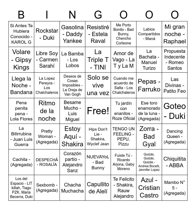 This bingo card has a free space and 61 words: A tu vera - Lola Flores, Pena penita pena - Lola Flores, Zamba de Mi Esperanza - Los Chalchaleros, La Lopez Pereyra - Los Chalchaleros, Besame Mucho - Luis Miguel, Quizás, Quizás, Quizás - Andrea Bocelli, Jennifer Lopez, Mi gran noche - Raphael, Libre - Nino Bravo, Libre Soy - Carmen Sarahí, Chiquitita - ABBA, Resistiré - Estela Raval, Corazón partío - Alejandro Sanz, Labios Compartidos - Maná, Estoy Aquí - Shakira, Azul - Cristian Castro, Si Antes Te Hubiera Conocido - KAROL G, La Bachata - Manuel Turizo, Me Porto Bonito - Bad Bunny, Chencho Corleone, Tití Me Preguntó - Bad Bunny, Volare - Gipsy Kings, Propuesta Indecente - Romeo Santos, Gasolina - Daddy Yankee, Las Divinas - Patito Feo, Pepas - Farruko, Danza Kuduro - Don Omar, Lucenzo, Hips Don't Lie - Shakira, Wyclef Jean, La Bilirrubina - Juan Luis Guerra, Suavemente - Elvis Crespo, La Bamba - Los Lobos, Zorra - Bad Gyal, Monotonía - Shakira, Ozuna, DESPECHÁ - ROSALÍA, Te Felicito - Shakira, Rauw Alejandro, She Don't Give a Fo - Duki, KHEA, Rockstar - Duki, Tu jardín con enanitos - Roze Oficial, NUEVAYoL - Bad Bunny, Amor de Vago - La T y La M, TENGO UN FEELING - PEPU, Pizzu, La Triple T - TINI, Fuiste Tú - Ricardo Arjona, Gaby Moreno, Deseos de Cosas Imposibles - La Oreja de Van Gogh, Llega la Noche - Bandana, Aprender A Quererte - Morat, Cuando me acuerdo de Salta - Los Chalchaleros, Goteo - Duki, Los del Espacio - LIT killah, Tiago PZK, Maria Becerra, Duki, Chacha Muchacha, Capullito de Alelí, Solo se vive una vez, Ritmo de la noche, Levantando las manos - (Agregada), Cachita - (Agregada), Ese toro enamorado de la luna - (Agregada), Un velero llamado libertad - (Agregada), Pretty Woman - (Agregada), Dancing Queen - (Agregada), Sexbomb - (Agregada), Dime que me quieres - (Agregada), Mambo N° 5 - (Agregada) and Batida de Coco - (Agregada).