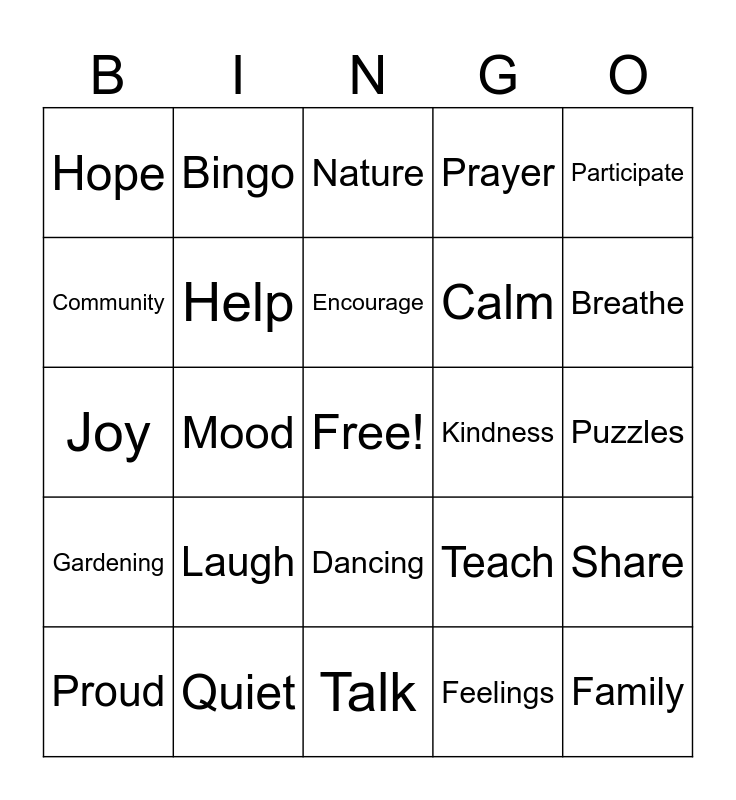 This bingo card has a free space and 52 words: Friends, Family, Visit, Talk, Laugh, Group, Bingo, Activities, Community, Together, Help, Volunteer, Share, Teach, Support, Welcome, Encourage, Kindness, Purpose, Participate, Mood, Feelings, Hope, Calm, Positive, Relax, Balance, Wellbeing, Breathe, Rest, Music, Prayer, Stretch, Walk, Sunshine, Nature, Quiet, Exercise, Reading, Games, Crafts, Puzzles, Gardening, Writing, Dancing, Cards, Happy, Joy, Smile, Peace, Proud and Grateful.