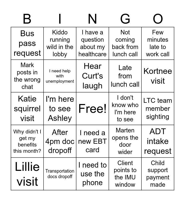 This bingo card has a free space and 24 words: After 4pm doc dropoff, Transportation docs dropoff, Hear Curt's laugh, Lillie visit, Few minutes late to work call, Bus pass request, Mark posts in the wrong chat, Kiddo running wild in the lobby, I don't know who I'm here to see, I need a new EBT card, Late from lunch call, Katie squirrel visit, Marten opens the door wider, ADT intake request, I need help with unemployment, Client points to the IMU window, LTC team member sighting, I have a question about my healthcare, Kortnee visit, I'm here to see Ashley, Child support payment made, Why didn't I get my benefits this month?, Not coming back from lunch call and I need to use the phone.