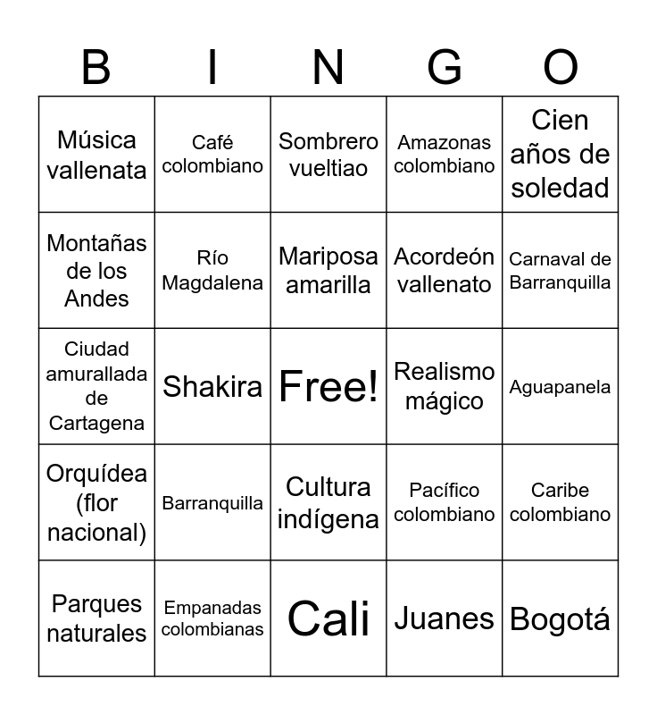 This bingo card has a free space and 50 words: Colombia, Bogotá, Medellín, Cali, Barranquilla, Cartagena, Café colombiano, Exportación de café, Montañas de los Andes, Selva amazónica, Río Magdalena, Amazonas colombiano, Caribe colombiano, Pacífico colombiano, Bandera amarilla, azul y roja, Biodiversidad, Mariposa amarilla, Realismo mágico, Gabriel García Márquez, Cien años de soledad, Shakira, Juanes, Música vallenata, Acordeón vallenato, Cumbia, Salsa caleña, Carnaval de Barranquilla, Feria de las Flores, Sombrero vueltiao, Cultura indígena, Cultura afrocolombiana, Arepa, Bandeja paisa, Ajiaco, Empanadas colombianas, Frutas tropicales, Maracuyá, Lulo, Guayaba, Aguapanela, Futbol colombiano, James Rodríguez, Bicicletas y ciclismo, Montañas verdes, Parques naturales, Ciudad amurallada de Cartagena, Mar Caribe, Cultura paisa, Orquídea (flor nacional) and Cóndor de los Andes.