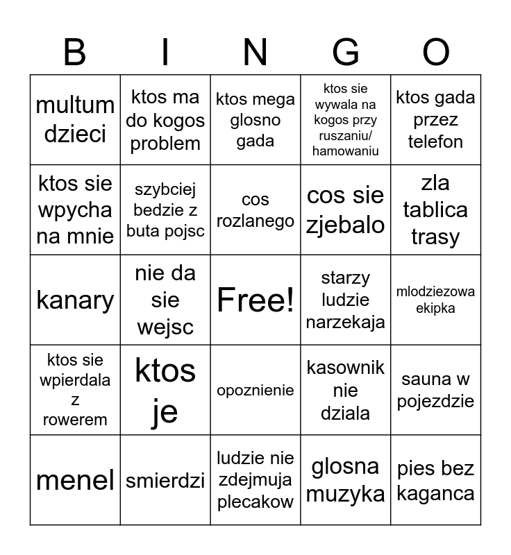 This bingo card has a free space and 24 words: ktos je, smierdzi, cos rozlanego, menel, ktos gada przez telefon, multum dzieci, ktos sie wpycha na mnie, ktos ma do kogos problem, starzy ludzie narzekaja, opoznienie, cos sie zjebalo, kanary, kasownik nie dziala, sauna w pojezdzie, szybciej bedzie z buta pojsc, glosna muzyka, mlodziezowa ekipka, ktos mega glosno gada, zla tablica trasy, nie da sie wejsc, pies bez kaganca, ktos sie wpierdala z rowerem, ktos sie wywala na kogos przy ruszaniu/ hamowaniu and ludzie nie zdejmuja plecakow.