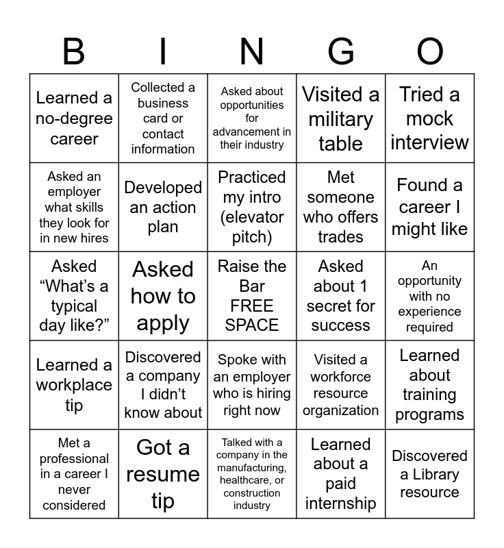 This bingo card has a free space and 26 words: Spoke with an employer who is hiring right now, Learned about a paid internship, Practiced my intro (elevator pitch), Got a resume tip, Tried a mock interview, Learned a no-degree career, Asked an employer what skills they look for in new hires, Collected a business card or contact information, An opportunity with no experience required, Visited a workforce resource organization, Met someone who offers trades, Asked “What’s a typical day like?”, Learned about training programs, Met a professional in a career I never considered, Asked how to apply, Asked a rep how they started their career, Visited a military table, Learned a workplace tip, Asked about opportunities for advancement in their industry, Discovered a Library resource, Found a career I might like, Talked with a company in the manufacturing, healthcare, or construction industry, Asked about 1 secret for success, Discovered a company I didn’t know about, Developed an action plan and Took a selfie or headshot.