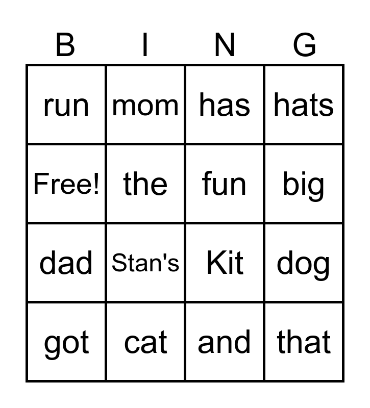 This bingo card has 16 words: cat, dog, has, run, dad, mom, Kit, and, Free!, the, got, hats, Stan's, big, fun and that.
